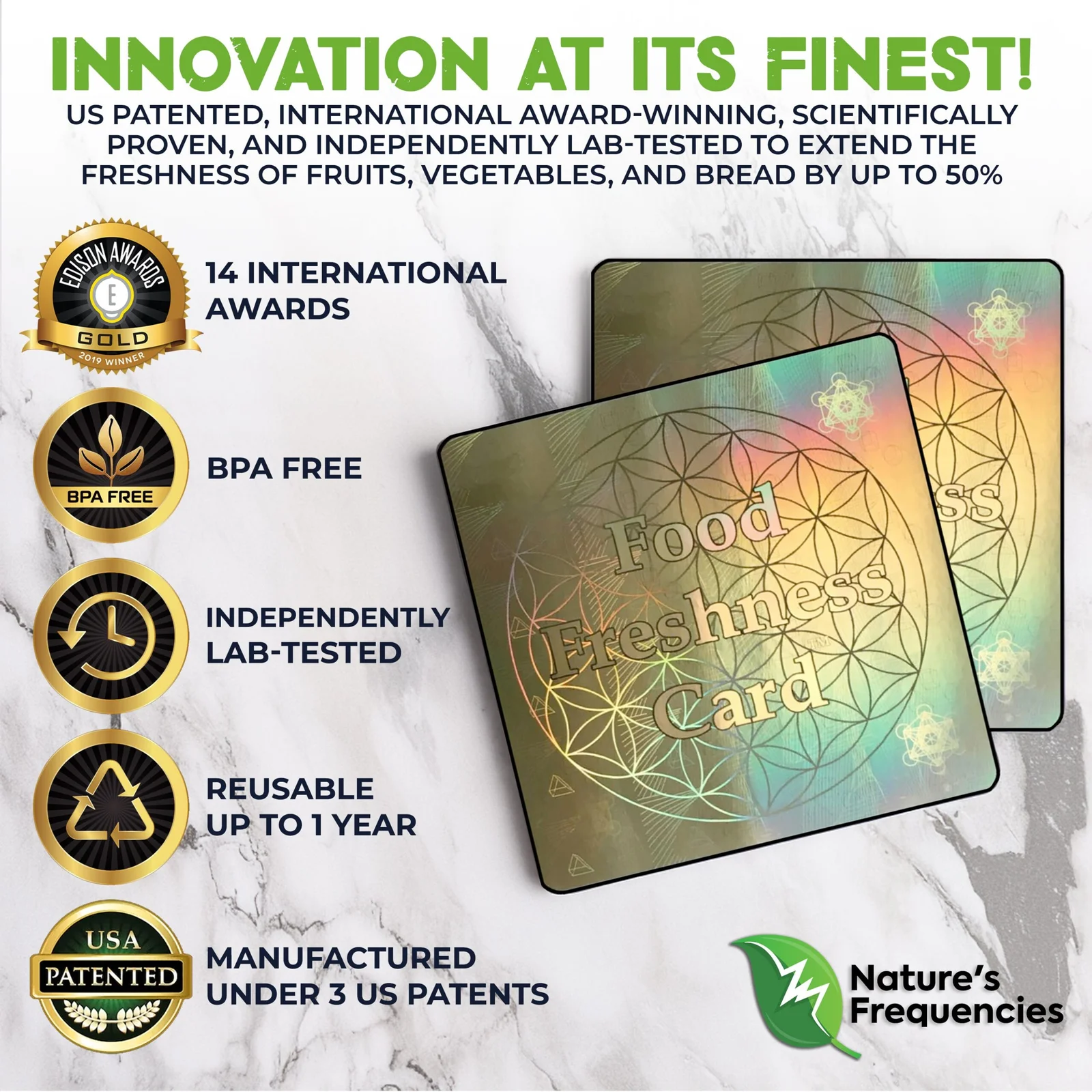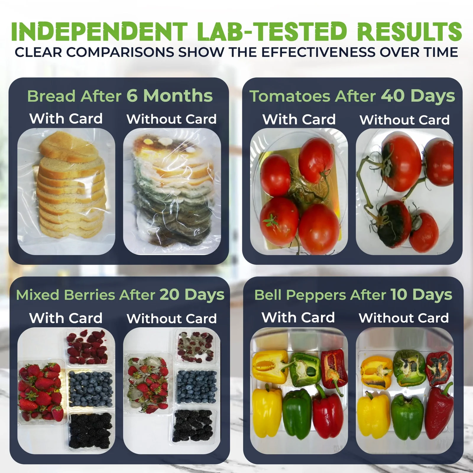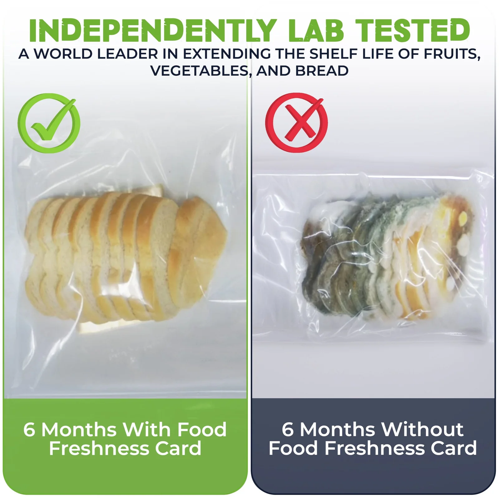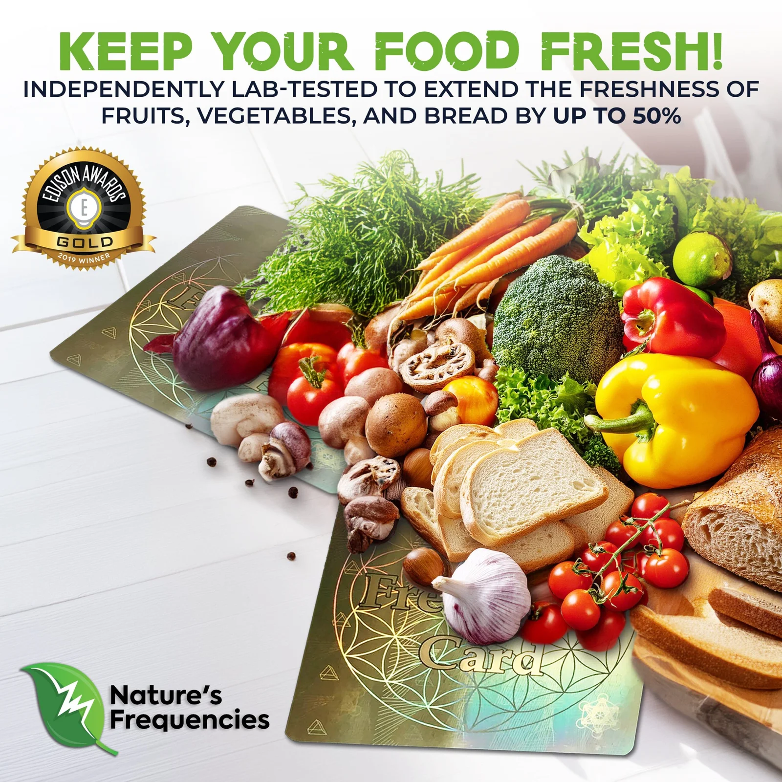 The Food Freshness Card® is a U.S. patented, award-winning technology independently lab tested to help keep food fresher up to 50% longer.